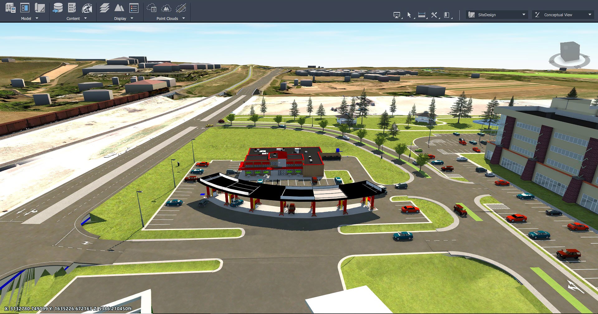 通过从 3ds Max、Revit 或 Civil 3D 导入三维模型,建立更真实的基础模型。通过将三维模型导入您的样式目录,对模型中的其他对象进行样式化。